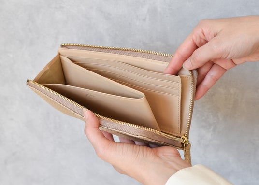 L字ファスナー長財布。中央の合わせがアクセントとなり、どこかモダンな雰囲気もお楽しみいただけます。