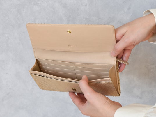巳年である2025年にもぴったり!金運アップの縁起物としても知られるパイソンレザー(蛇革)を、gentenらしく優雅で上品な、やさしいサンドベージュのお色で仕上げました。