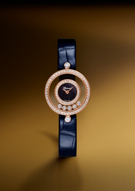 丸みを帯びたフェミニンなフォルムを描く26mm径の「ハッピーダイヤモンド」ウォッチ。そのユニークでアイコニックなデザインは、時分針を備えた中央のケースを、ダイヤモンドをあしらった18Kエシカルローズゴールド製のセコンドベゼルが取り囲みます。間に配された2枚のサファイアクリスタルの間では、5つのムービングダイヤモンドが揺れ動き、12時と6時位置にあしらわれたダイヤモンドに共鳴します。そして、アトリエの頭脳の結晶ともいえる、ケース裏面の時刻調整のためのプッシュボタン。ケースサイドのリューズを取り払うことで、ウォッチが描く完璧な円を維持しつつ、軽やかな仕上がりとなっています。永遠に続く歓喜に満ちたダンスの舞台で、「ハッピーダイヤモンド」が魅せる華麗なステップは、ムービングダイヤモンドが誕生して以来、ショパールが演出し続けてきたコレオグラフィーなのです。