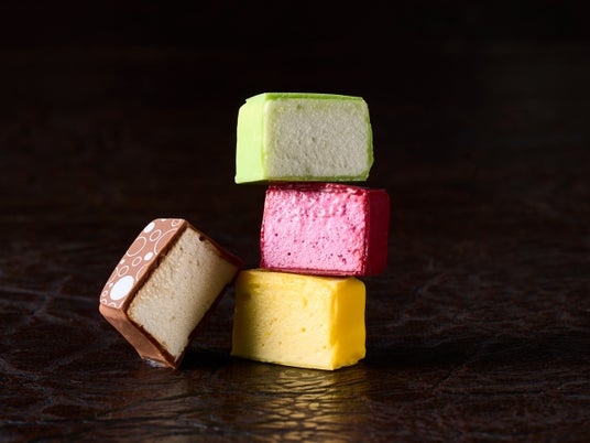 カシス、ライム、パッションフルーツマンゴー、バナナの4種のフルーツピューレを使ったギモーブを、チョコレートで薄くコーティング。パリっとしたチョコレートの食感と、ギモーブのふわりと柔らかな舌触り、そして果実のフルーティーな風味が重なります。