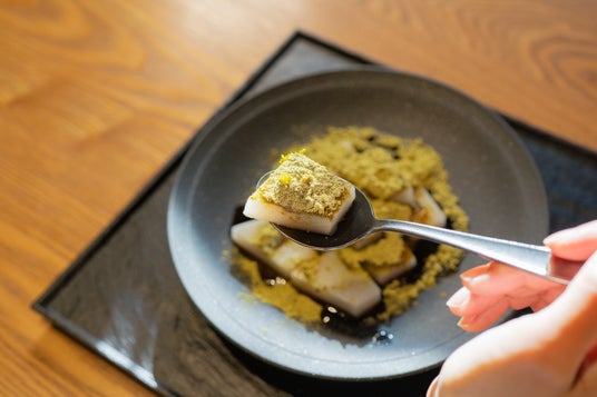 定番のくず餅は、上品な甘さの黒蜜と、香ばしいきな粉をかけてお召し上がりいただきます。