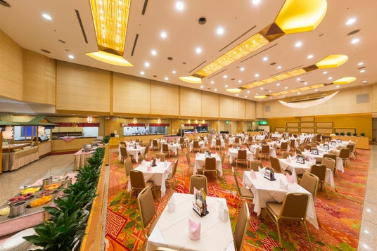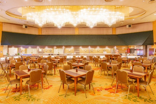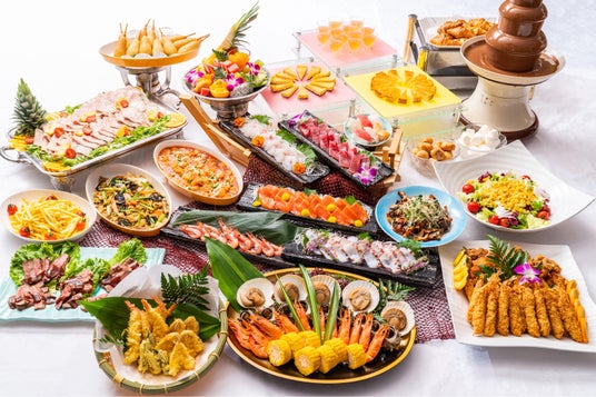 大きなビュフェ会場では、海鮮料理をはじめ揚げたての天ぷらなど和洋中料理が味わえます。