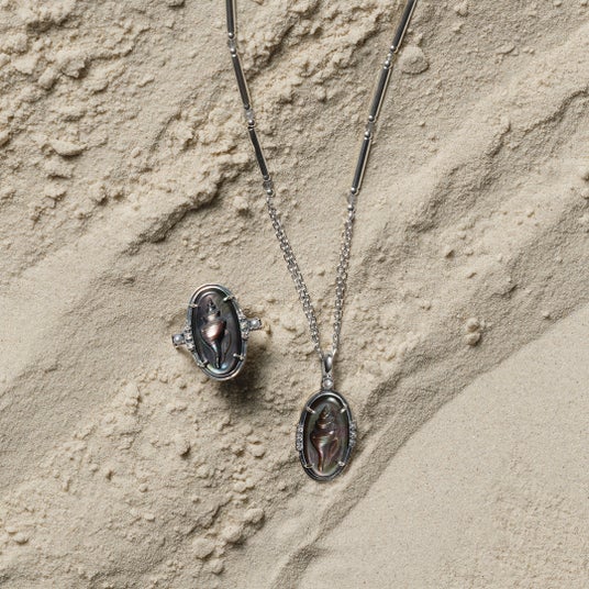 シンプルだからこそ光るテクニック貝のシルエットがセンターに堂々と施されたカメオ。わかりやすいモチーフでありながら、どことなく大人っぽい雰囲気なのは、白蝶貝のシックな佇まいに、ダイヤモンドとパールの輝きがプラスされているから。シンプルなものこそ細やかなディティールが生きて、表情を豊かにしてくれる。