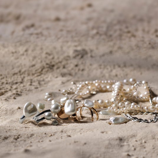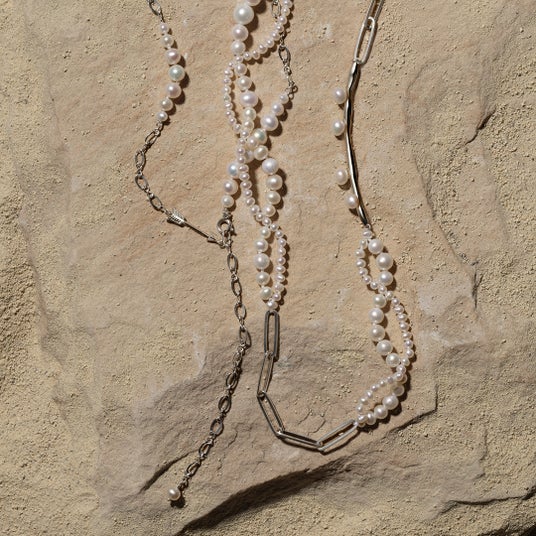 上質をカジュアルに纏う、贅沢パールのモダンな表情を引き出すのは、有機的な曲線を描くシルバー素材のパーツやチェーン。パールの持つ上質な雰囲気はそのままに、心地よい抜け感を生み出している。
