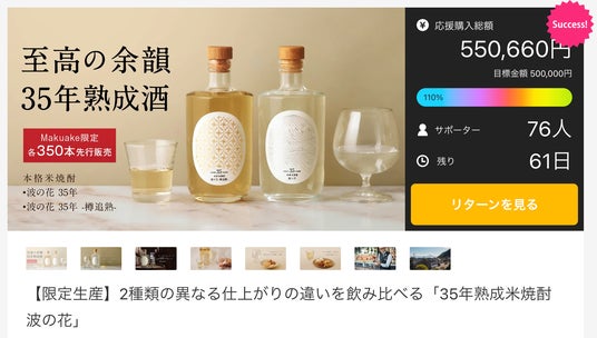 白金酒造株式会社は、2024年12月25日(水)より、35年熟成米焼酎〈波の花〉をMakuake限定の先行販売開始いたしました。