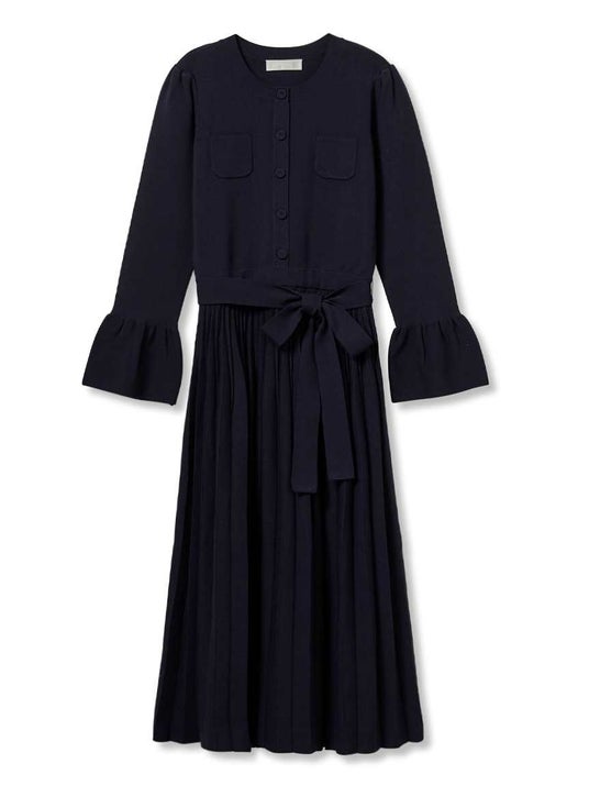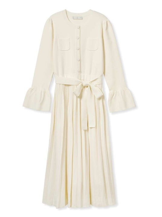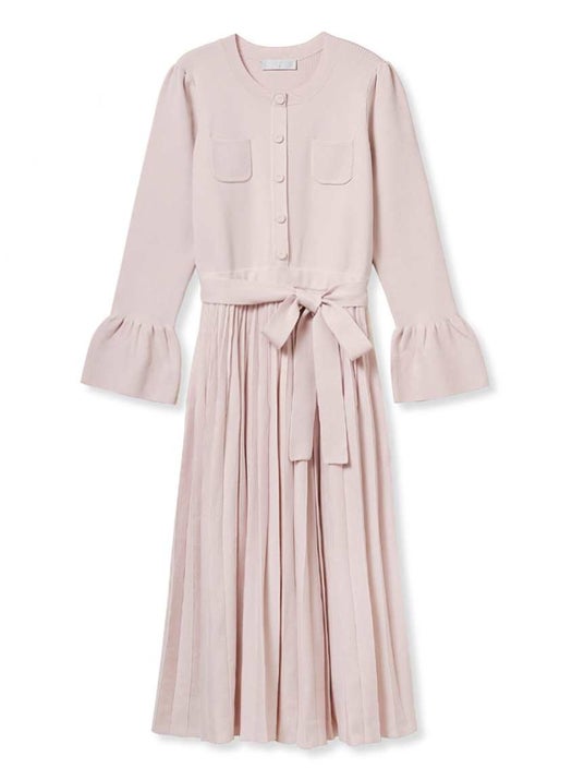 上品なフレアシルエットのプリーツライクニットワンピースが