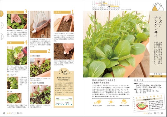 ミニトマトやナス、ダイコンはもちろん、スイカやトウモロコシまで、多彩な野菜の育て方を収録。「準備」「タネまき」「間引き」「追肥」「収穫」といった育成ステップを、豊富な写真とともに詳しく紹介しています。
