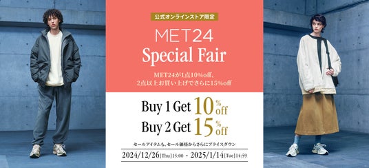 都会の24時間をデザインするウェア「MET24(メットトゥエンティフォー)」コレクションの全商品を対象に、1点お買い上げの方は10%off、2点以上でさらに15%offとなります。