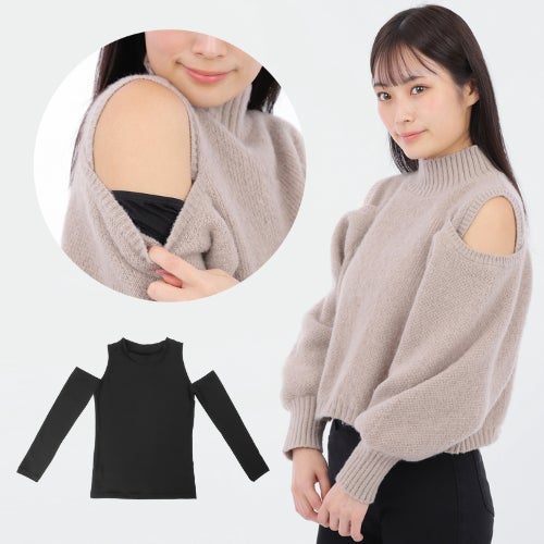 『肩見せぬくもりインナー』は、寒いのが大の苦手なスタッフが、肩見せニットを着用する際にちょうど良いインナーがどこにも売っておらず、仕方なく袖のないインナーを着て外に出たところ、寒さに耐えられず結局ずっと上着を着たままになってしまった……という苦い経験から生まれた商品です。