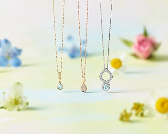 <ネックレス左から>¥39,600(K10YG/アクアマリン/ダイヤモンド) ¥68,200(K18PG/ダイヤモンド) ¥125,400(PT/アクアマリン/ダイヤモンド)※全て数量限定品