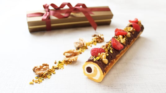 生地は秋田県産米粉を使用し、しっとりでもっちりと焼き上げ、カカオマスから作った自家製チョコカスタードと、濃厚でコクのある北海道産純生クリームを、一緒に巻き上げました。