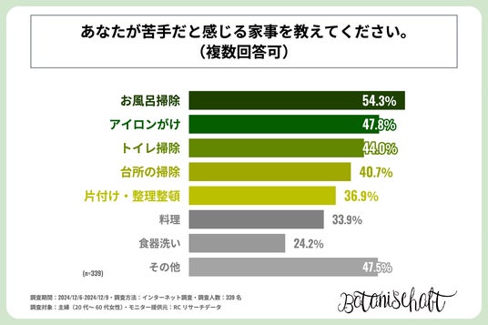 まず、「苦手だと感じる家事」を尋ねる設問では、1位が「お風呂掃除」で54.3%、2位が「アイロンがけ」で47.8%、3位が「トイレ掃除」で44.0%、4位が「台所の掃除」で40.7%という結果になりました。この結果から、「お風呂掃除」を筆頭に掃除に関する家事を苦手だと感じている人が多いことがわかりました。