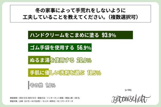 調査の最後、冬の家事によって手荒れをしないように工夫していると回答された方に「冬の家事によって手荒れしないように工夫していること」を尋ねる設問では、1位が「ハンドクリームをこまめに塗る」で93.9%、2位が「ゴム手袋を使用する」で56.9%、3位が「ぬるま湯を使用する」で20.0%、4位が「手肌に優しい洗剤を選ぶ」で18.5%という結果になりました。この結果から、冬の家事による手荒れ対策として「ハンドクリーム」をこまめに使用する人が多いことが判明しました。