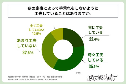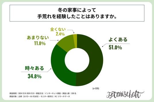 寒さが徐々に厳しくなり乾燥が進む冬の季節、手荒れや肌トラブルに悩まれる女性も多いものと思われます。特に年末年始は、家族や友人との集まりが増えたり、大掃除があったりと家事の頻度が高まり、手肌への負担がかかる時期ではないでしょうか。そこで、「BOTANISCHAFT(ボタニシャフト)」を展開する株式会社SASSEは、主婦を対象に「冬の家事と手荒れ」に関する調査を実施しました。