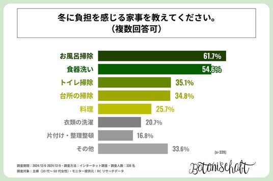 ・冬に負担を感じる家事、1位「お風呂掃除」、2位「食器洗い」、3位「トイレ掃除」