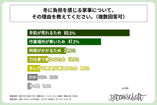続いて「冬に負担を感じる家事についてその理由」を尋ねる設問への回答では、1位が 「手肌が荒れるため」で65.5%、2位が「作業場所が寒いため」で47.2%という結果になりました。この結果から、冬の家事で負担に感じることは「手肌の荒れ」と「寒さ」が主な理由であることが明らかになりました。