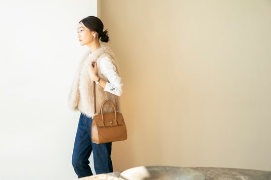 ミニボストンバッグはフラップデザインが特徴的なデザイン。フラップ部分には上品なスムースレザーを、メイン部分はシュリンク型押しレザーを用いることで、同色で落ち着いた印象ながらも遊び心の効いたデザインとなっております。またショルダーベルトも付属し、ハンドバッグとしてもショルダーバッグとしても活躍。カラーはブラックとキャメルの2色展開で、オケージョンシーンからカジュアルシーンまで幅広いご用途にご使用いただけます。