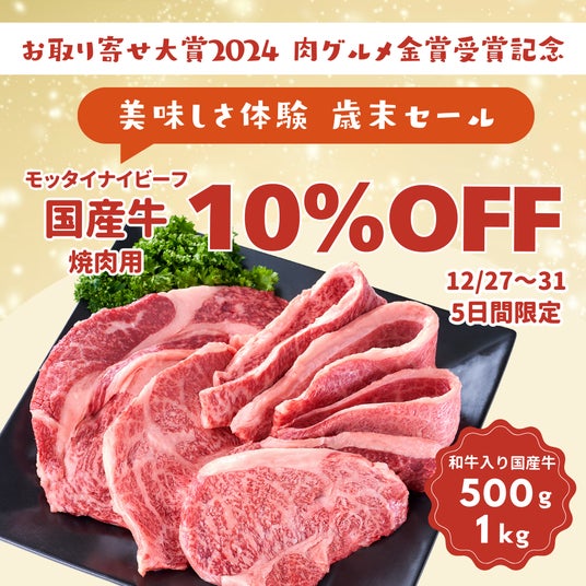 受賞を記念しまして、モッタイナイビーフ公式オンラインストアでは2024年12月27日(金)から31日(火)にかけて“おいしさ体験 歳末セール”として、受賞した「モッタイナイビーフ 国産牛 焼肉用」が10%OFFでお買い求めいただけるセールを実施中です。