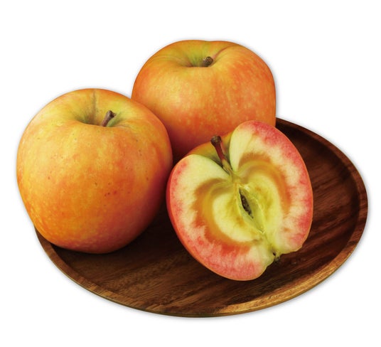 『ムーンルージュ』は高めの糖度とほどよい酸味で、甘くジューシーな味わい。皮が黄色く、割ってみると不思議なピンク色のグラデーションが広がる、長野県生まれの珍しいりんごです。