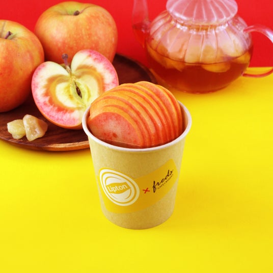 リプトン むっちゃアップルティーリプトンのアップルティーに信州産セミドライりんごと、長野県飯綱町産の『ムーンルージュ』を贅沢に1/4個分をカットしトッピング。さらにアップルシロップで風味を引き出したまさにりんご尽くしな一杯です。ひと口飲めば、りんごの甘みとフルーティーな香りが口いっぱいにふわりと広がります!