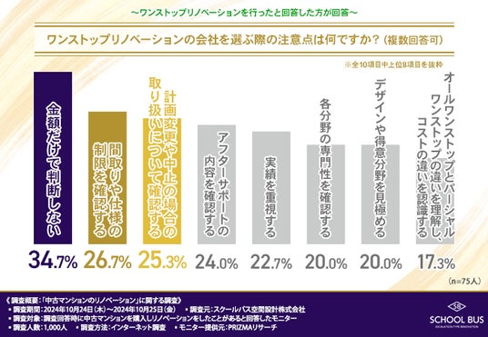 最後に、ワンストップリノベーションを行ったと回答した方に「ワンストップリノベーションの会社を選ぶ際の注意点は何ですか?(複数回答可)」と質問したところ、『金額だけで判断しない(34.7%)』が最も多く、『間取りや仕様の制限を確認する(26.7%)』『計画変更や中止の場合の取り扱いについて確認する(25.3%)』と続きました。