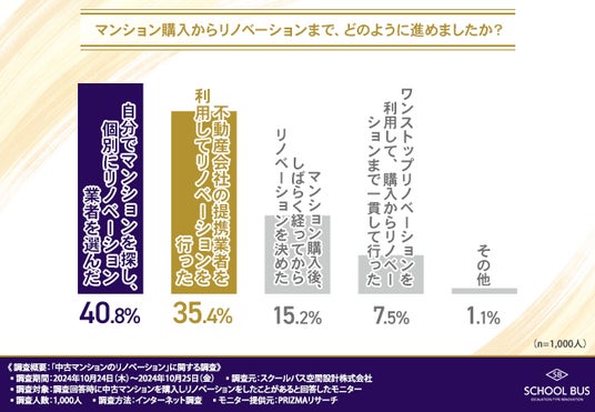 そこで、「マンション購入からリノベーションまで、どのように進めましたか?」と質問したところ、『自分でマンションを探し、個別にリノベーション業者を選んだ(40.8%)』が最も多く、『不動産会社の提携業者を利用してリノベーションを行った(35.4%)』と続きました。