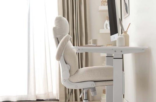 (写真:アームレストを跳ね上げてスッキリデスクに収納できる)