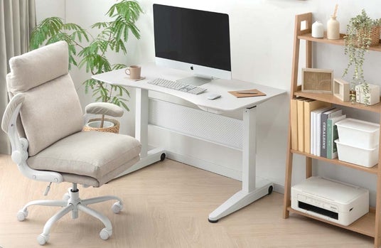 【タンスのゲン】ホワイト フレーム×ナチュラルカラーのクッションでご自宅のインテリアに馴染む!デスクチェアでは珍しいカバーリングタイプながら、充実の5つの機能を搭載