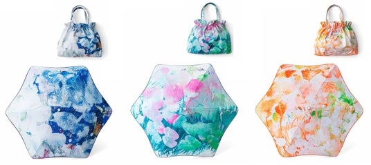 開けばまるで一枚の絵画のような、チャレンジドアートデザインの晴雨兼用折りたたみ傘です。露先はカーブしたやさしい形状で、内生地はUVカット機能を備えながらも気分を明るくしてくれる配色が特徴です。きちんとたたまなくても入れやすい大きめのきんちゃくバッグ付きです。