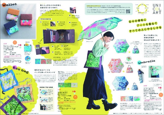 unique・color・artを合わせた言葉。チャレンジドのアーティストが描く作品にアレンジを加えて、オリジナルのテキスタイルや雑貨をつくるプロジェクトです。販売価格の一部はチャレンジドのアーティストに還元されるとともに、「ユUNICOLART基金」として障がい者アート支援団体に拠出され、チャレンジドアーティストの育成支援のために運用されます。描く人、作る人、使う人がアートの力でつながり、だれもが個性を発揮できる社会を目指します。