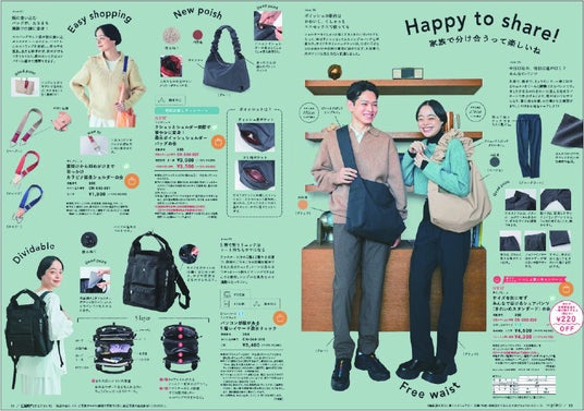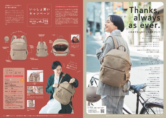 フェリシモが展開するママと家族のための雑貨ブランド「L’AMI+[ラミプリュス]」は新作アイテムを発表、デジタルカタログを公開して12月6日よりウェブ販売を行っています。新作は、チョコレートバイヤーみりコラボ「特殊繊維で結ばずピタッ 持ち手が付いてる大きめサイズのひっつクロスの会」やポケットが充実した「クラシカルリュック」、ウエスト調整自在な「サイズを気にせずみんなではけるシェアパンツ〈きれいめスタンダード〉の会」、価格のうち40円は「UNICOLART基金」として運用されるチャレンジドアートデザインの「先のとがっていないやさしい折りたたみ UVカット晴雨兼用傘の会」などです。アイテムの詳細は、特集ページやデジタルカタログでチェックできます。