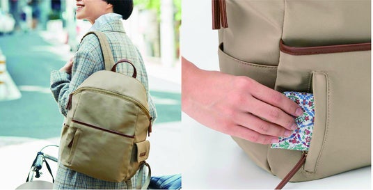ポケットが充実し、出し入れしやすい工夫がうれしい、上品ベージュのきれいめリュックです。メインスペースはストレートファスナーで、肩に掛けたままでも手が届きやすく、サッと開け閉めができます。背中側には書類整理に便利なPC収納スペースを備え、底だまりを防ぐリュック内上部のハンモックホルダーもついています。