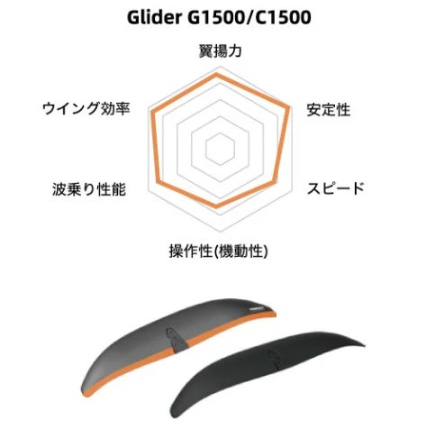 標準セットのフロントウイング Glider G1500 は、ストレートフライトでの安定感と優れたターンコントロール性を備え、長距離のライディングに最適です。スタビライザーウイングは Gliding Tail 320 が付属し、横方向の安定性を高め、波でターンする際に快適なスタンスを確保します。