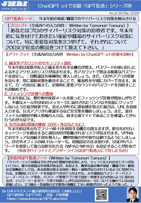 そのような時期に、家庭や職場でのセキュリティ対策として、どのようなことに留意して取り組めばいいかについて、生成AI「ChatGPT o1」に例示・出力させてGPT監査を行い、以下の通り公開致しました。