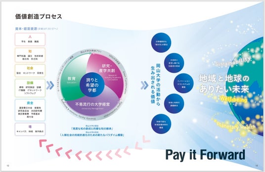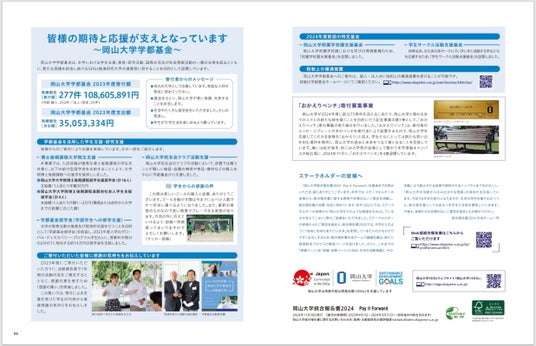 様々なステークホルダーの皆様に、岡山大学の掲げるビジョンからそこに向けた戦略と、これまでの実績をわかりやすく説明しています。このたび、最新号となる「岡山大学統合報告書2024 Pay it Forward」を2024年12月21日に発行しました。