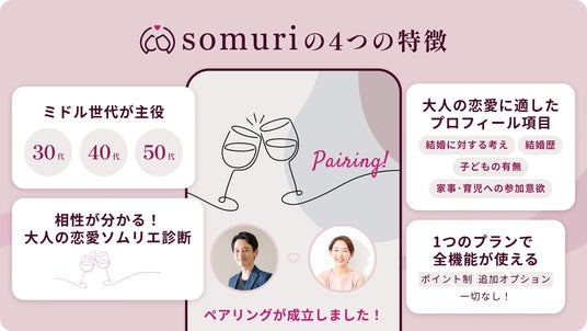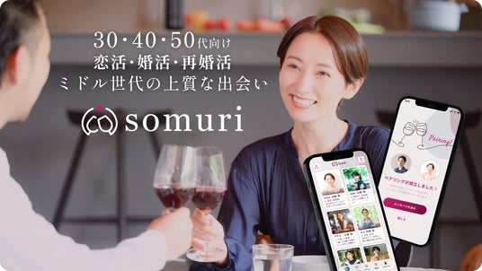「Somuri(ソムリ)」は30・40・50代のミドル世代の婚活・再婚活・パートナー探しを応援し、上質な出会いを提供するマッチングアプリです。