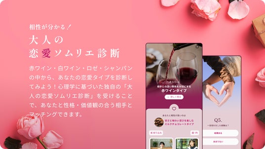 経験を重ねた大人の世界観をワインに重ね合わせて、「Somuri(ソムリ)」は生まれました。「Somuri」に無料登録すると、心理学に基づいた独自の「大人の恋愛ソムリエ診断」を受けることができます。赤ワイン・白ワイン・ロゼ・シャンパンの中からで自分の恋愛タイプを診断し、性格・価値観の合う相手とマッチングしやすくなります。