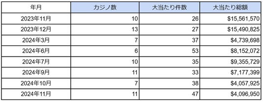 ※2024年11月時点での海外カジノごとの大当たり件数と総額
