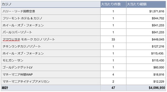 大当たりが出た回数で見ると、「アクウェサネ モホーク カジノ リゾート」で33件となっており、回数の多さが際立ちます。