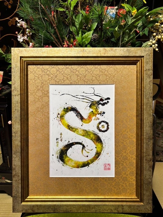 黄金のフレームに宿る龍の力強さと気品。サークルの中にあしらわれた宇宙金箔が、唯一無二の輝きを放ちます。