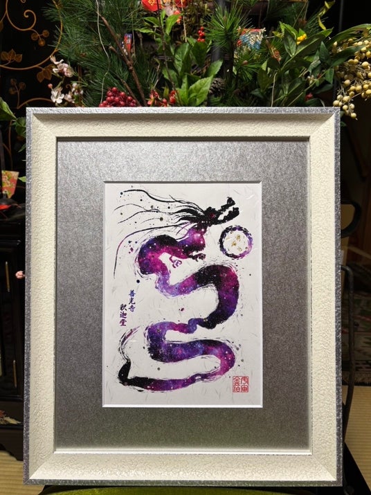 紫の龍が描く神秘的な世界。サークルの中に煌めく宇宙金箔が、壮大な宇宙の物語を物語ります。