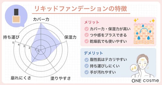リキッドファンデーションは、カバー力が高く、メイク崩れを起こしにくいという特徴があります。数あるファンデーションの中でもカバー力はダントツ!さらに崩れにくいというメリットもあります。