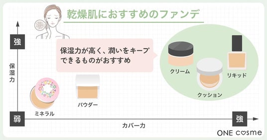 リキッド・クリーム・クッションタイプのファンデーションは水分や油分の量が多いので、メイクしながら肌のうるおいをキープすることができます。