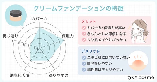 クリームファンデーションは、保湿力の高いファンデーションです。乾燥肌の人でも、粉拭きの心配なく使えますよ。