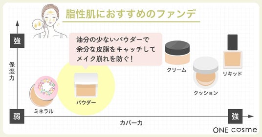 脂性肌さんには、油分の少ないパウダーで余分な皮脂をキャッチしてくれるパウダーファンデーションがおすすめです。皮脂によるメイク崩れを防げます。