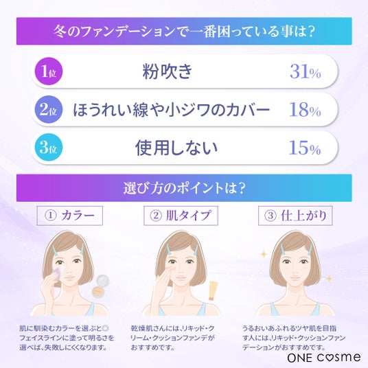 ファンデーションを選ぶ際には「カバー力」を重視する人が多いですが、冬は「粉拭き」が気になる人が多く、乾燥対策を重視する人が多いのかもしれません。