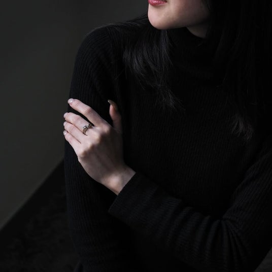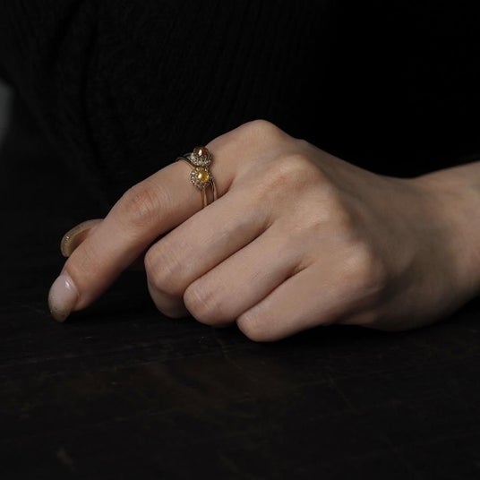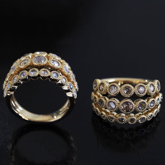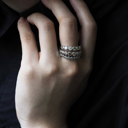 一見するとサイズ違いのリングを3本重ねづけしているように見えるデザイン。しかし、実際にはそれぞれの間に生まれる“余白”が、重ねづけとは異なる佇まいを生み出しました。ラグジュアリーでありながら、大人の女性の手許に凛とした印象を与える、この唯一無二の指環は、パーセル ジュエリーの新たな挑戦の象徴です。