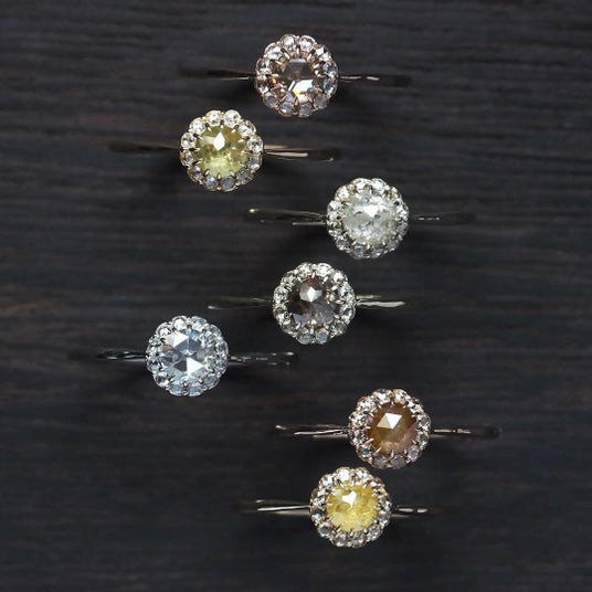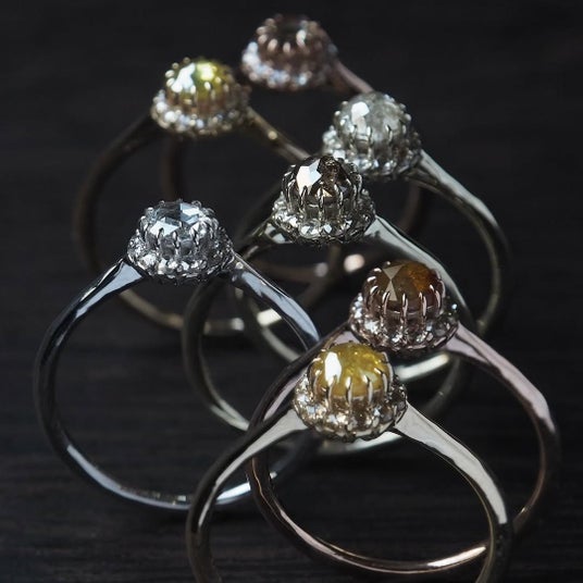 本作では、その中でも特にカットが美しく厚みのあるものを厳選。VSクラスの高品質のホワイトをはじめ、ナチュラルカラーのイエローやブラウン、スノーホワイトなど、多彩な表情を持つダイヤモンドを取り入れています。リングのアームには、通常のポンポネとは異なる槌目加工を施し、さらにバフで滑らかに仕上げることで、溶けた水面のような柔らかい輝きを演出。繊細で可憐な4mmサイズのダイヤモンドと相まって、優雅さと親しみやすさを兼ね備えた仕上がりとなっています。