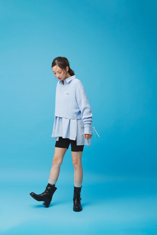 シャツとのレイヤードスタイルで知的な雰囲気。
