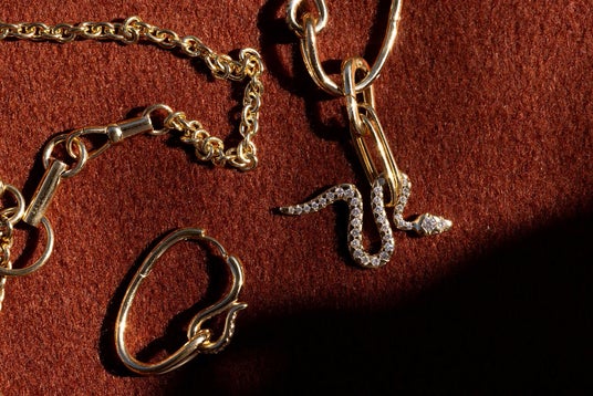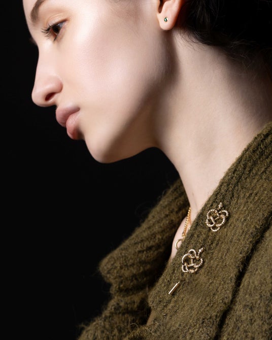 エジプト装飾に始まり、世界中で絵画やタペストリーに描かれ、護符として重用されてきた「蛇」のモチーフ。自由にしなやかに、流れるようなスネークの造形は、ジュエリーにシンボリックな存在感を生み出します。深遠なモチーフを敢えてカジュアルなスタイリングで、さりげないリュクス感を楽しんで。